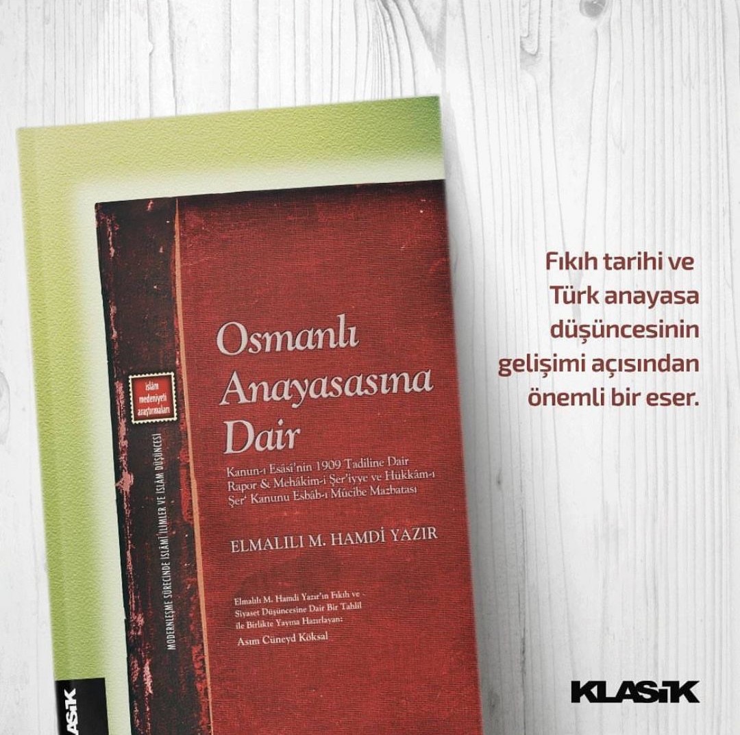 Hak Dini Kur’an Dili adlı tefsiriyle tanınan son devir din âlimlerinden Elmalılı Muhammed Hamdi Yazır’ın (1878-1942) Osmanlı Anayasasına Dair adlı eseri Klasik Yayınları’ndan çıktı. Eseri yayına Asım Cüneyd Köksal hazırladı.