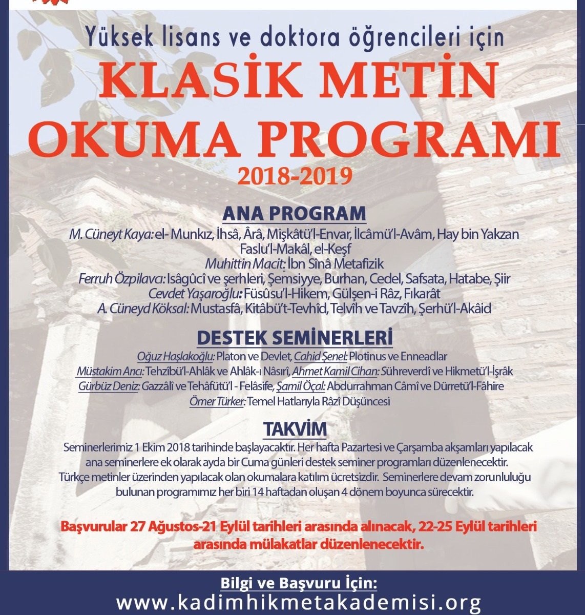 Kadim Hikmet Akademisi’nin yüksek lisans ve doktora öğrencileri için gerçekleştirdiği klasik metin okuma programına yapılacak başvurular 27 Ağustos-21 Eylül 2018 tarihleri arasında kabul edilecek. Dersler 1 Ekim 2018’de başlayacak.