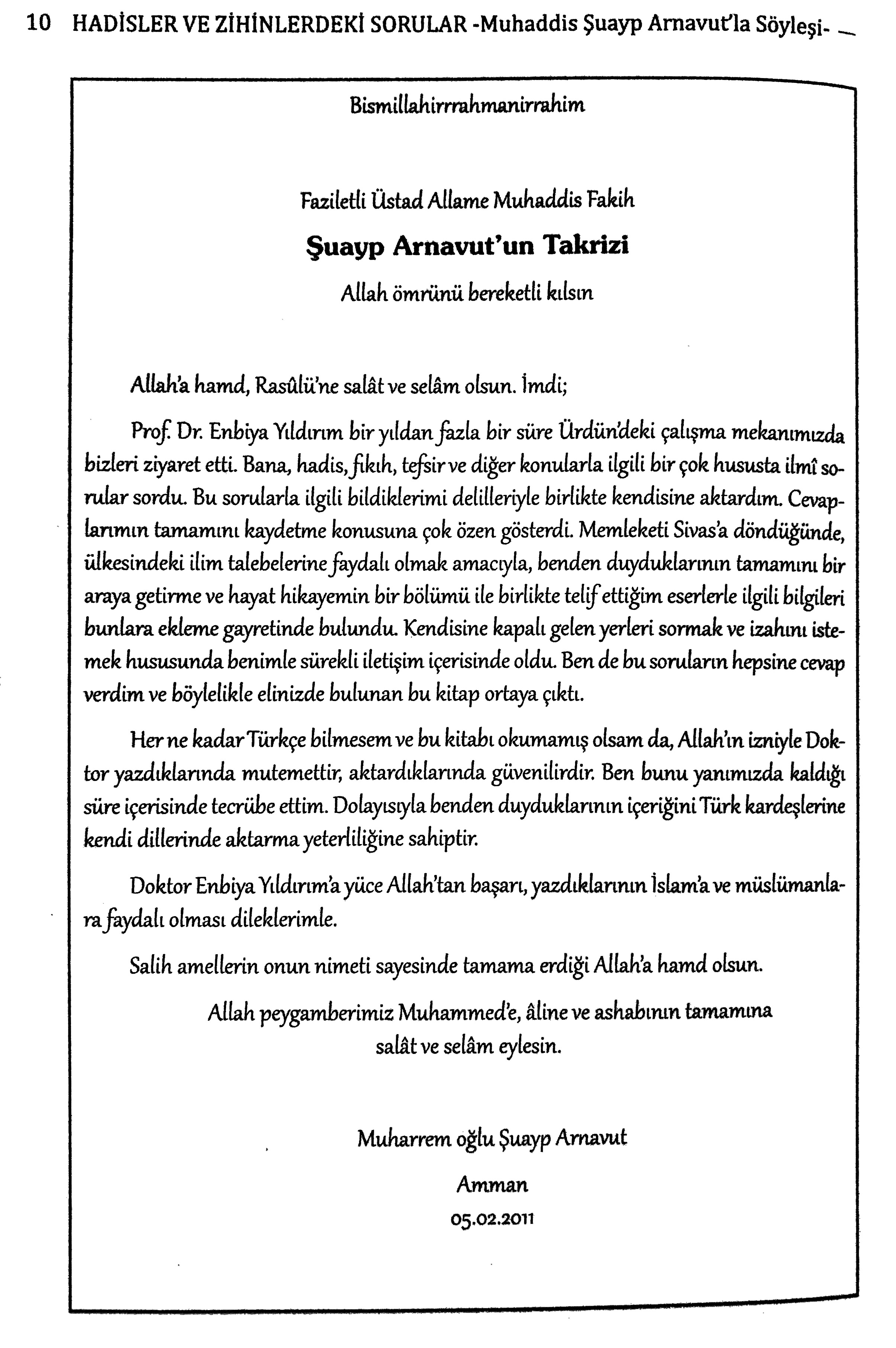 Şuayp Arnavut'un Kitaba Yazdığı Takrizin Türkçesi