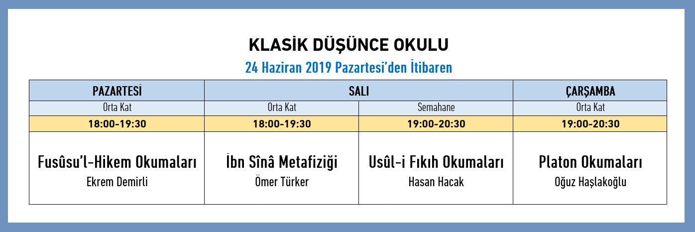 Klasik Düşünce Okulu’nun yaz dönemi programındaki bazı seminerler belli oldu. Üsküdar İskenderbaba Tekkesi’nde herkese açık olarak gerçekleşecek seminerler 24 Haziran Pazartesi günü başlayacak. Seminerlere dair detayları afişimizde bulabilirsiniz.