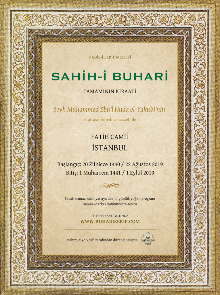 Şeyh Muhammed Ebu’l Hudâ el-Yakubî’nin muttasıl senedi ve icazeti ile Sahih-i Buhari Sema’ Meclisi düzenleniyor. Mahmudiye Vakfı tarafından düzenlenen program, hanım ve erkek katılımcılara açık ve yoğun bir program olacak.