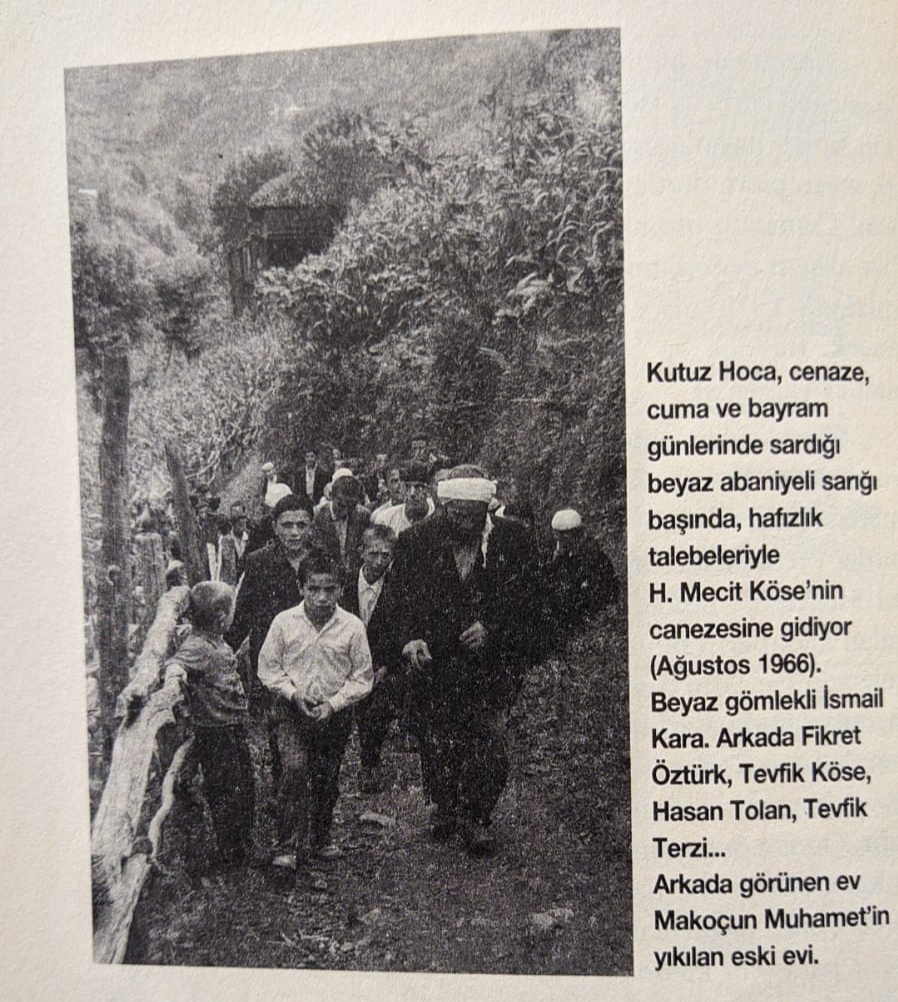 Yanlış hatırlamıyorsam Cuma günü idi. Civar köylere de haber verildiği için Cuma namazında Dere (Merkez) Camii lebâleb doluydu. Duanın yapılacağı alan camiye 10 dakikalık bir mesafede idi. Namazdan sonra yaşlısı, genci, çocuğu herkes Afın Sağı’na doğru yöneldi. Yol boyu gittikçe uzanan bir kalabalık… Duayı idare edecek olan köyün Büyük Camii imamı Kutuz Hoca diğer hoca arkadaşlarıyla birlikte önde gidiyor. Daima sarıklı olan Hocaefendi normal zamanlarda takke üzerine sarı renkli, hafif dal işlemeli ve kısa püsküllü abaniye sarar, sadece Cuma, bayram ve cenaze namazlarında beyaz abaniye kuşanırdı. Yine sadece böyle günlerde giydiği uzun perdesü ile beyaz sarık onu daha heybetli ve uzun boylu gösterirdi. Cenazelerde bastonunu da yanında bulundurur, telkin okurken ona yaslanırdı. Bugün de bastonu yanındaydı.