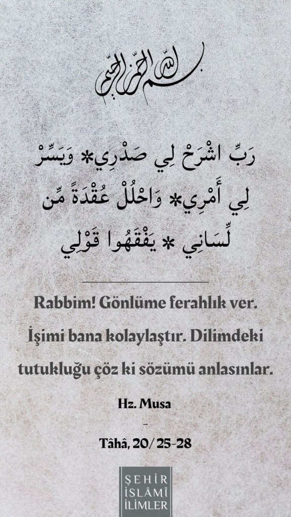 “Rabbim! Gönlüme ferahlık ver. İşimi bana kolaylaştır. Dilimden tutukluğu çöz ki sözümü anlasınlar.” (Taha 25-28)